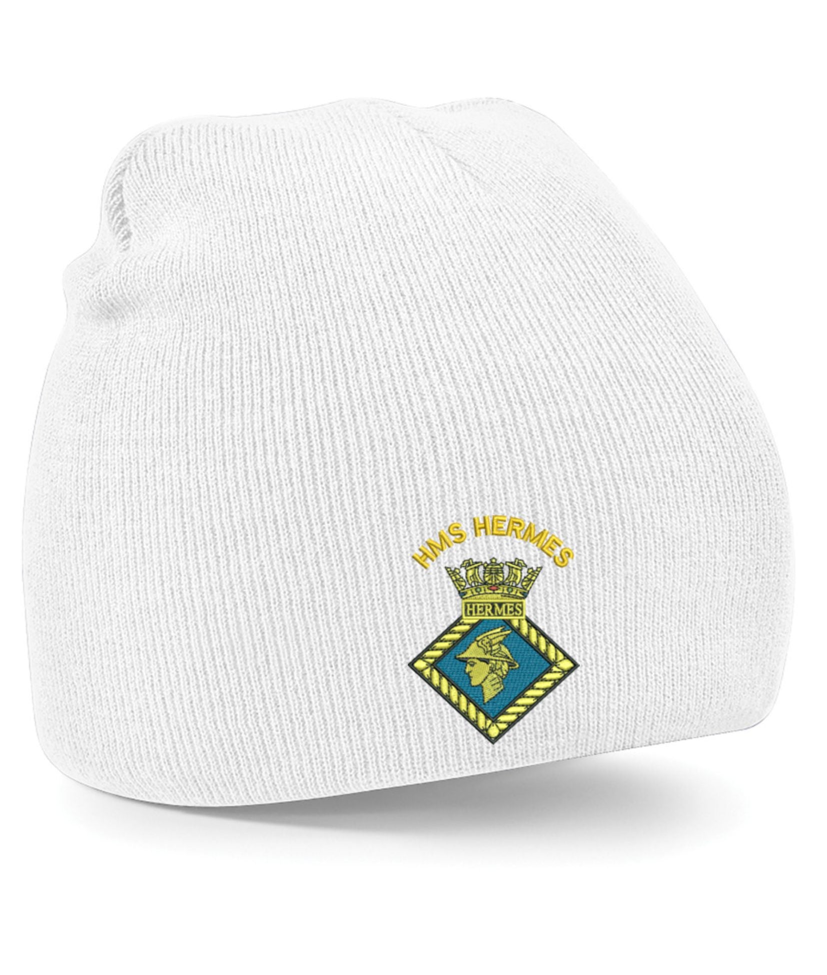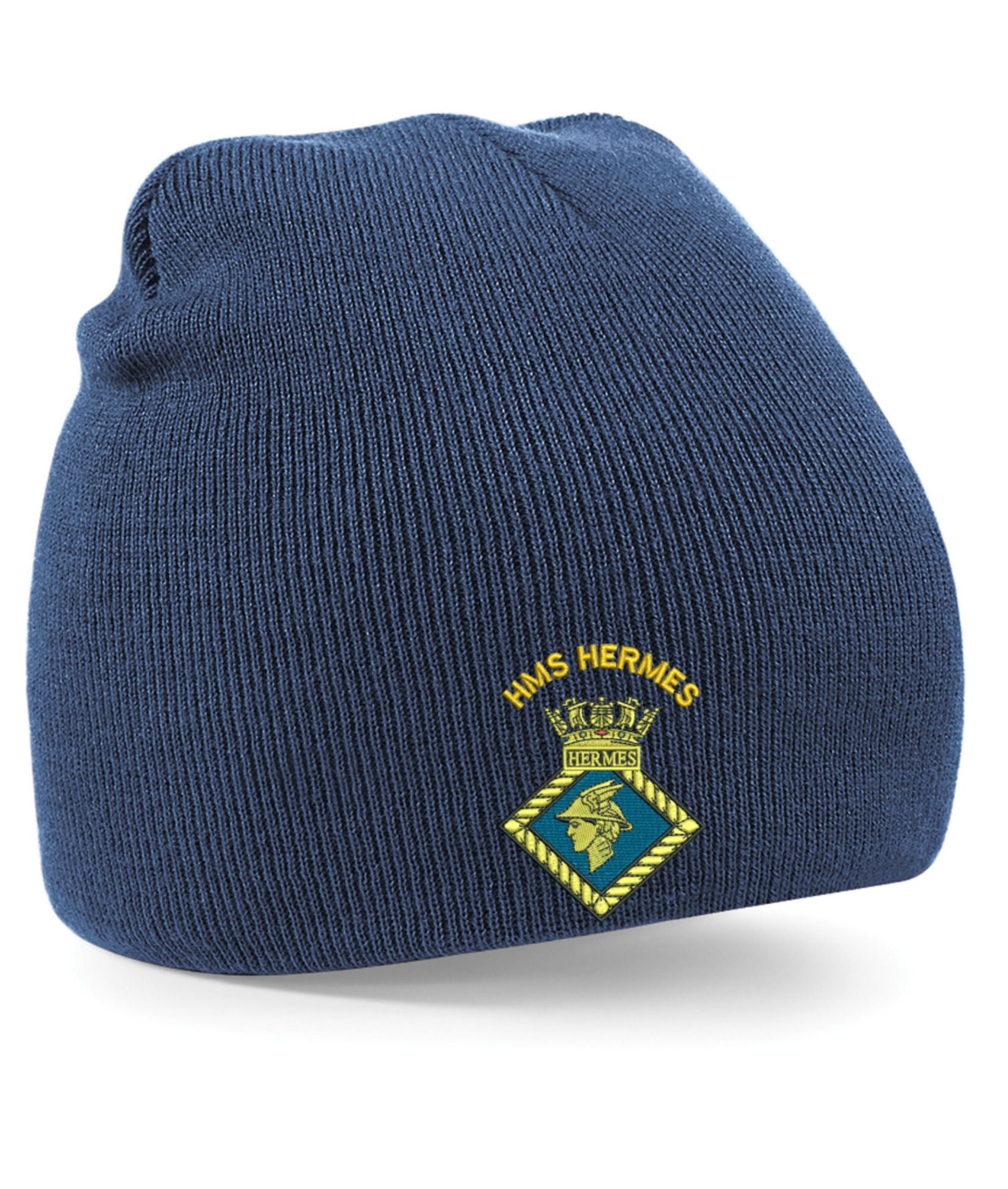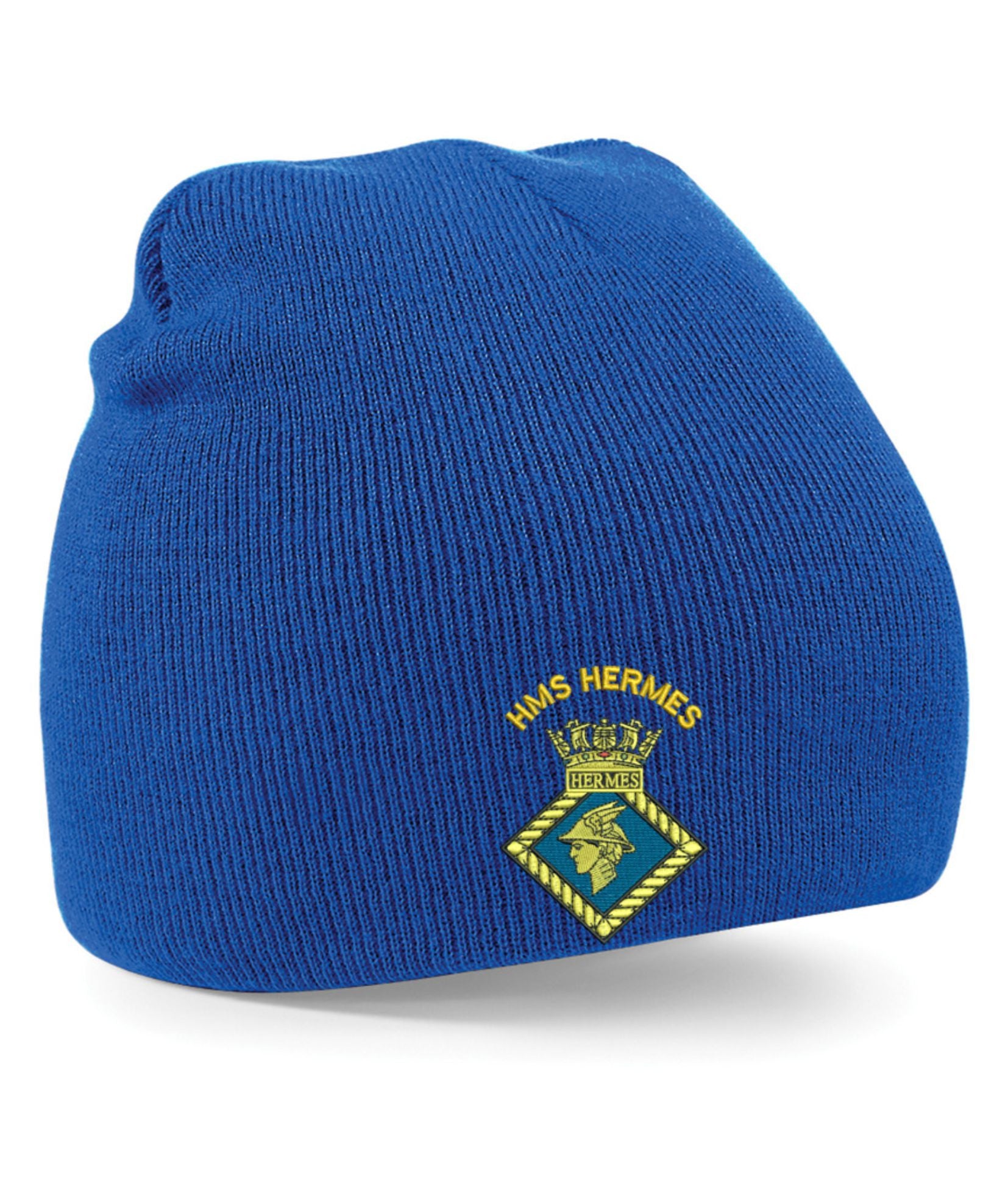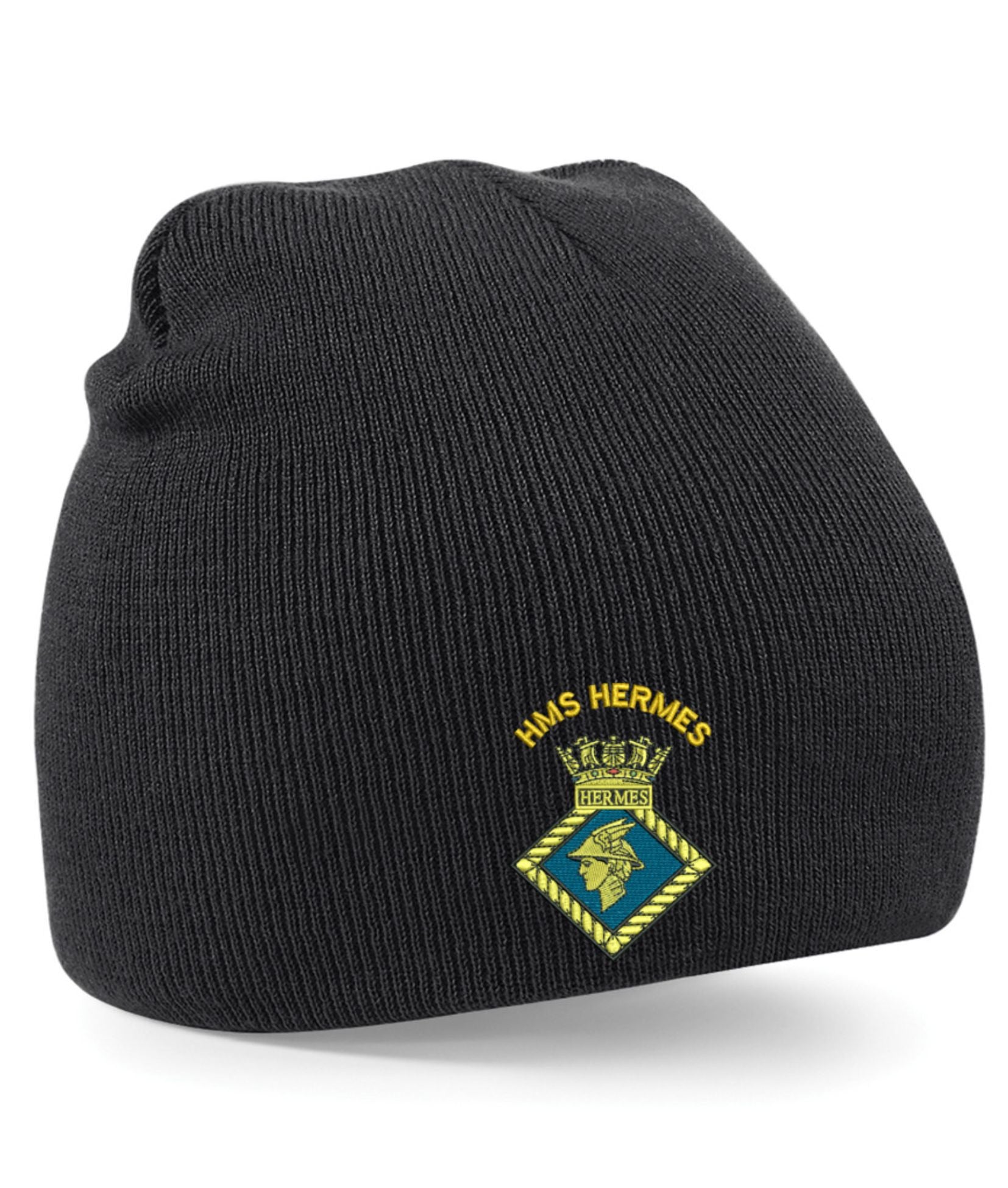 HMS Hermes Beanie Hats . The crest is then embroidered onto the Regimental Embroidered Clothing after you have selected the Size, Colour and Qty. Please allow up to three working days for your order to be processed as the item has to be embroidered first. Large orders of 15 or more may take longer.