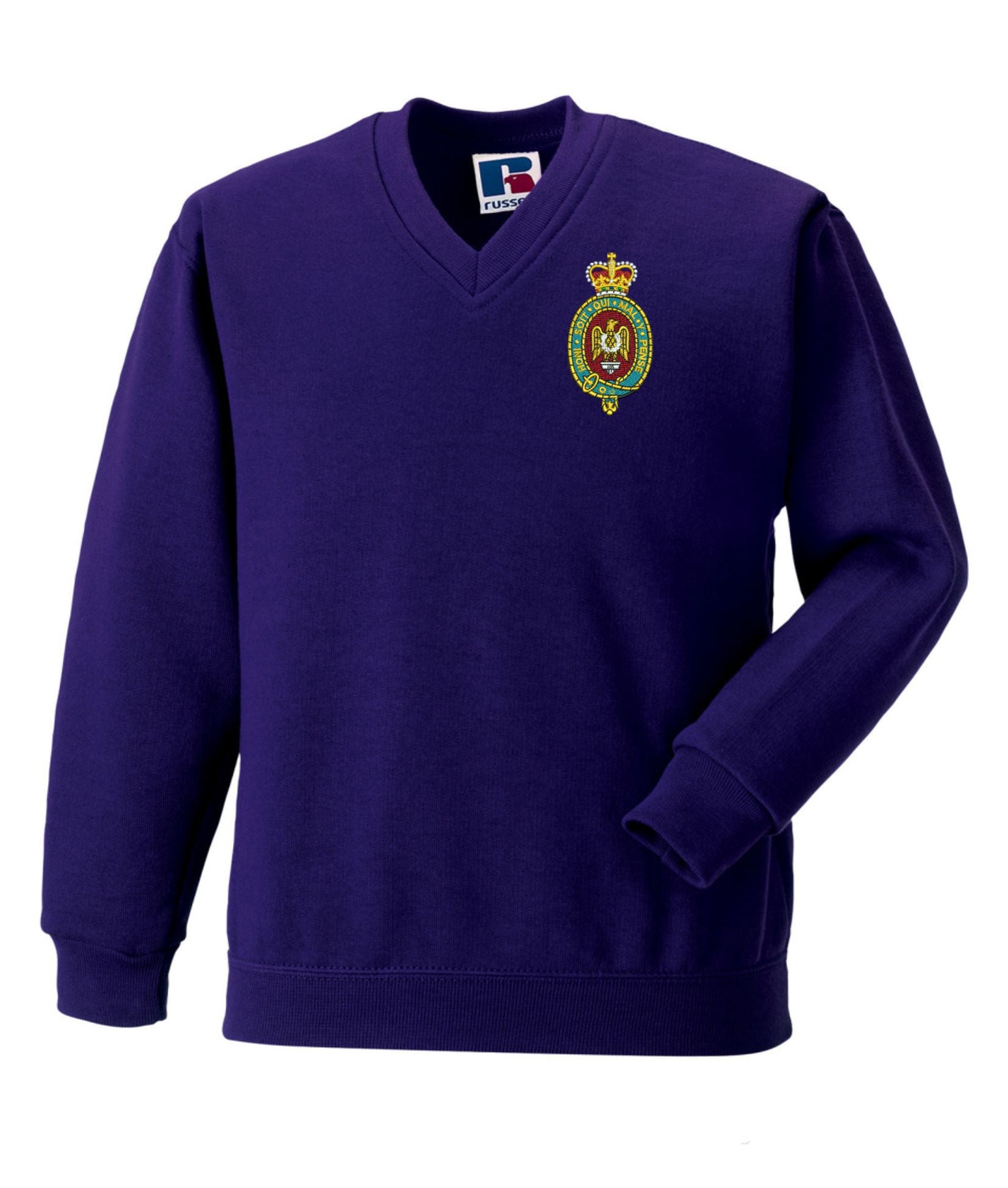 Blues And Royal V Neck Sweatshirt is made by russell. The logo is then embroidered onto the embroidered Regimental clothing after you have selected the Size, Colour and Qty. Please allow up to three working days for your order to be processed as the item has to be embroidered first. Large orders of 15 or more may take longe