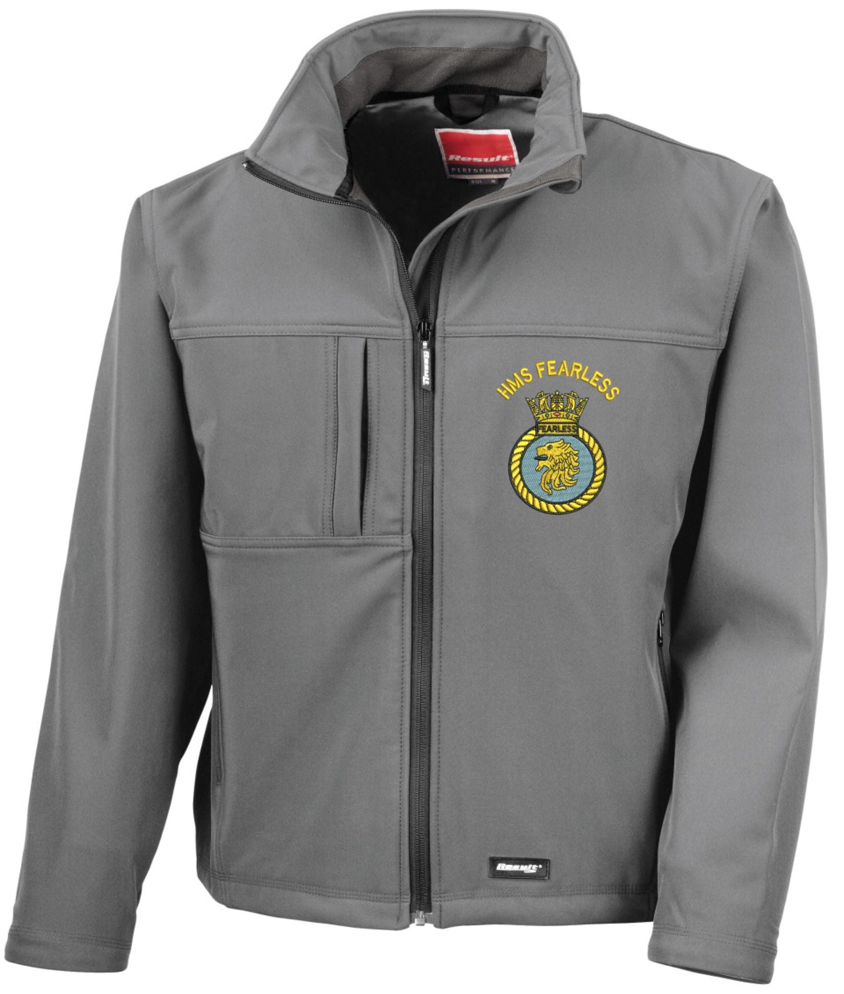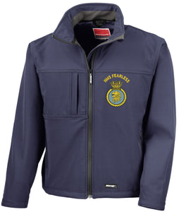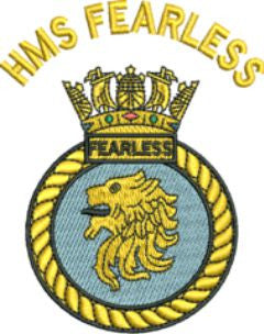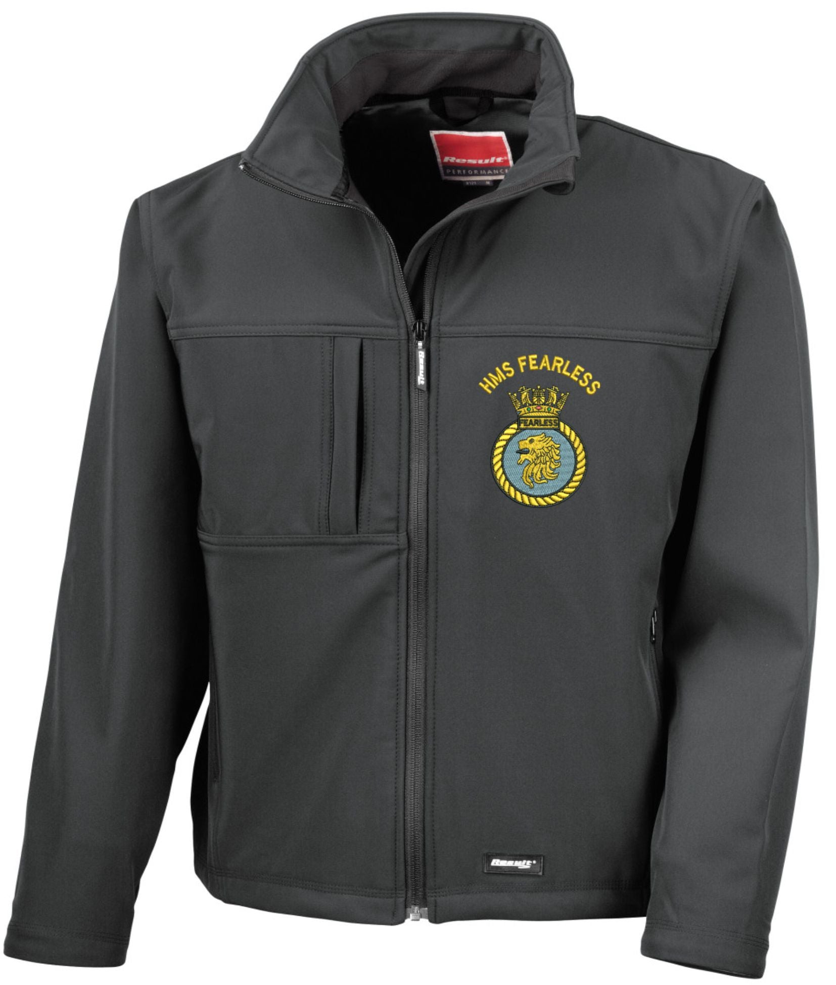HMS Fearless Softshell clothing made all clothing . The crest is then embroidered onto the softshell jacket after you have selected the Size, Colour and Qty.  Please allow up to three working days for your order to be processed as the item has to be embroidered first.  Large orders of 15 or more may take longer.