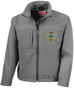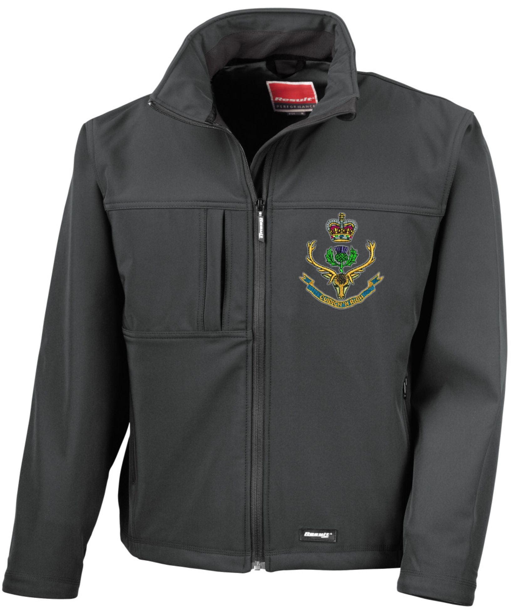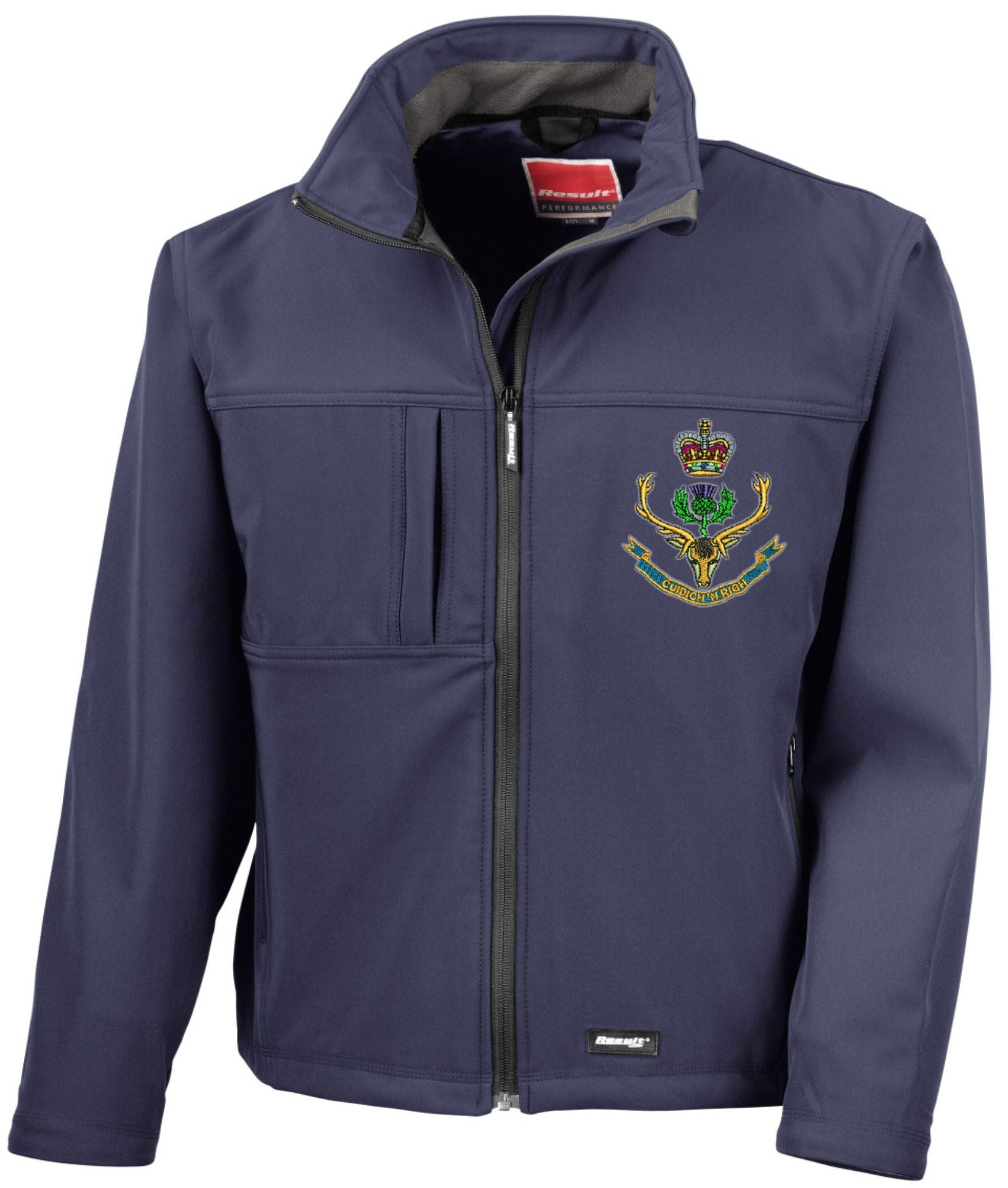 Queens Own Highlanders Softshell clothing made all clothing . The crest is then embroidered onto the softshell jacket after you have selected the Size, Colour and Qty.  Please allow up to three working days for your order to be processed as the item has to be embroidered first.  Large orders of 15 or more may take longer.