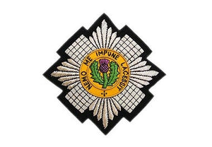 Scots Guards Bullion Wire Blazer Badge This badge has been hand crafted made with fine quality gold and silver wire All our blazer badges vary in size according to the regiment/design but all are designed to fit onto a standard sized blazer pocket.