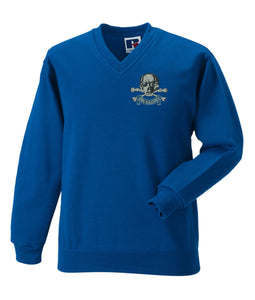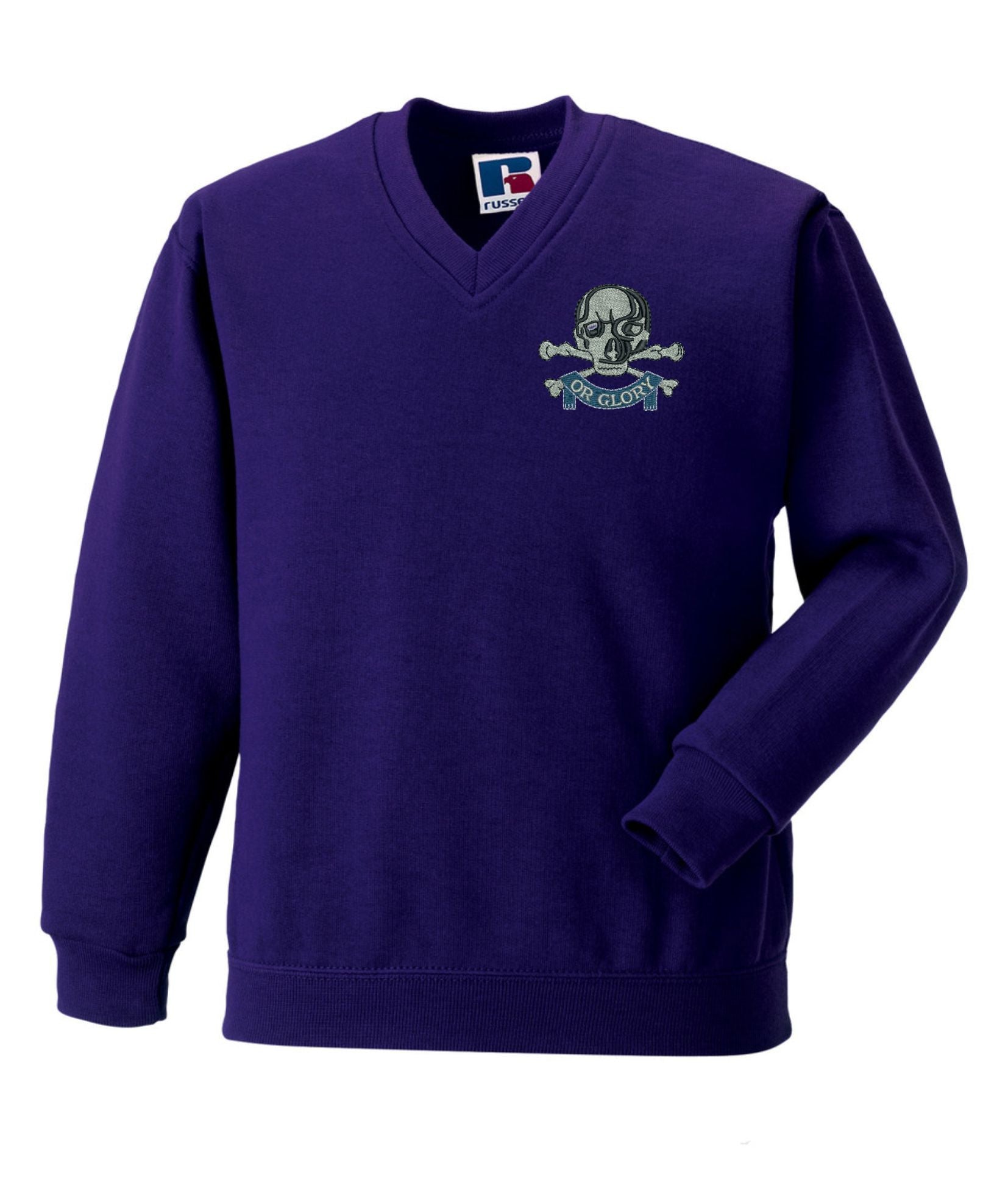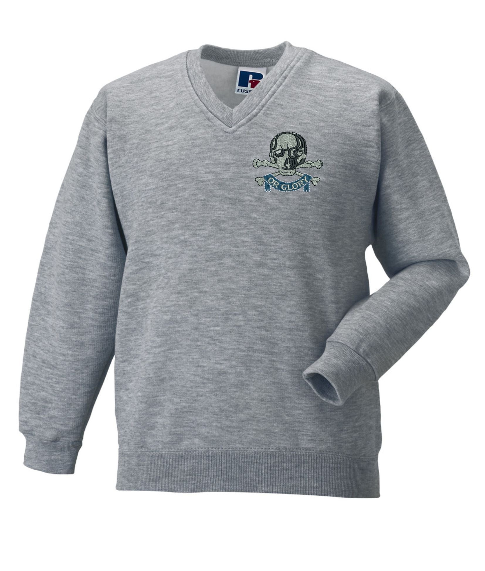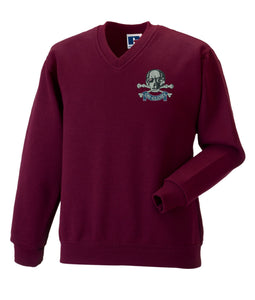 17th/21st Lancers V Neck Sweatshirt is made by russell. The logo is then embroidered onto the embroidered Regimental clothing after you have selected the Size, Colour and Qty.  Please allow up to three working days for your order to be processed as the item has to be embroidered first.  Large orders of 15 or more may take longe