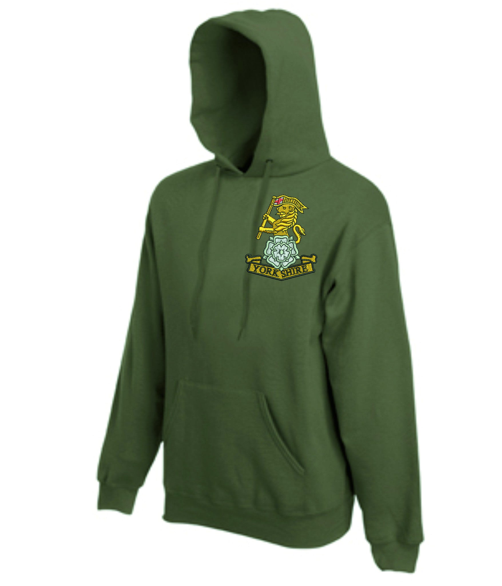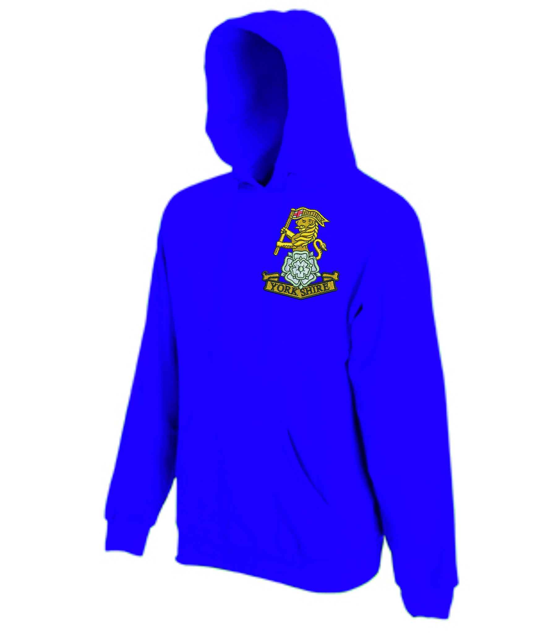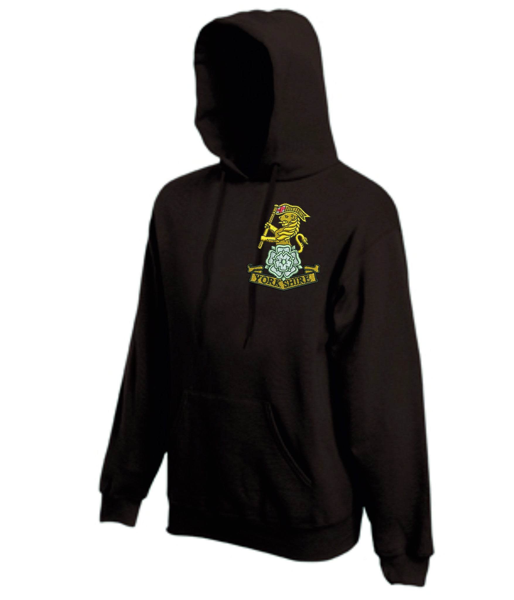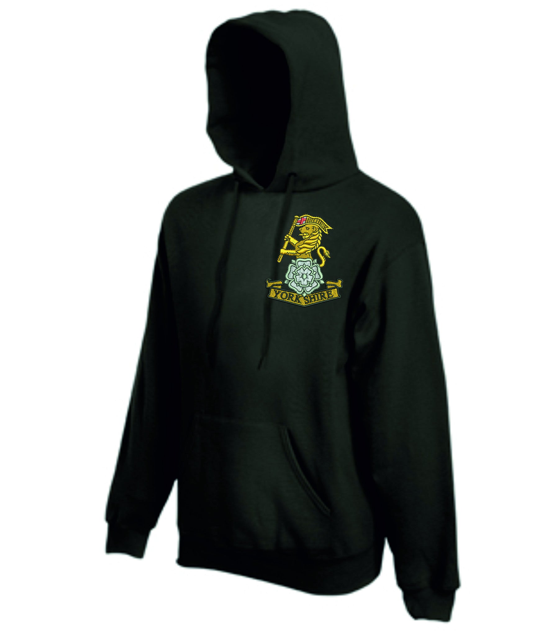 Yorkshire Regiment Hoodie is made by Fruit of the Loom. The logo is then embroidered onto the t-shirt after you have selected the Size, Colour and Qty. Please allow up to three working days for your order to be processed as the item has to be embroidered first. Large orders of 15 or more may take longer.